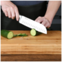 Нож Сантоку — это универсальный инструмент на кухне, идеально подходящий для различных кулинарных задач. Он подходит для шинковки овощей, тонкой нарезки, а также разделки мяса и рыбы. Специальные углубления на поверхности лезвия уменьшают риск прилипания продуктов, поскольку между ними и ножом остается воздух. Кухонные ножи из серии KOCH изготовлены из высококачественной стали 5Cr15MoV, закаленной до 57 единиц по шкале Роквелла, что придает им замечательную прочность и делает пригодными для регулярного использования. Лезвия имеют симметричную двустороннюю заточку, что обеспечивает легкость при нарезке и разделке продуктов. Утолщенная пята клинка защищает пальцы от соскальзывания и предоставляет дополнительный упор во время работы. Каждая модель также оснащена больстером из нержавеющей стали, который равномерно распределяет нагрузку, делая использование ножа более комфортным.