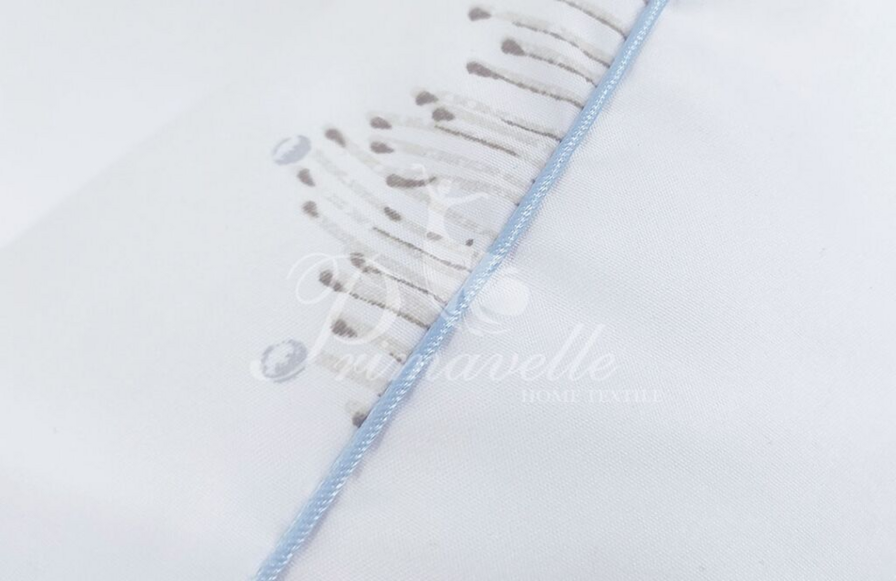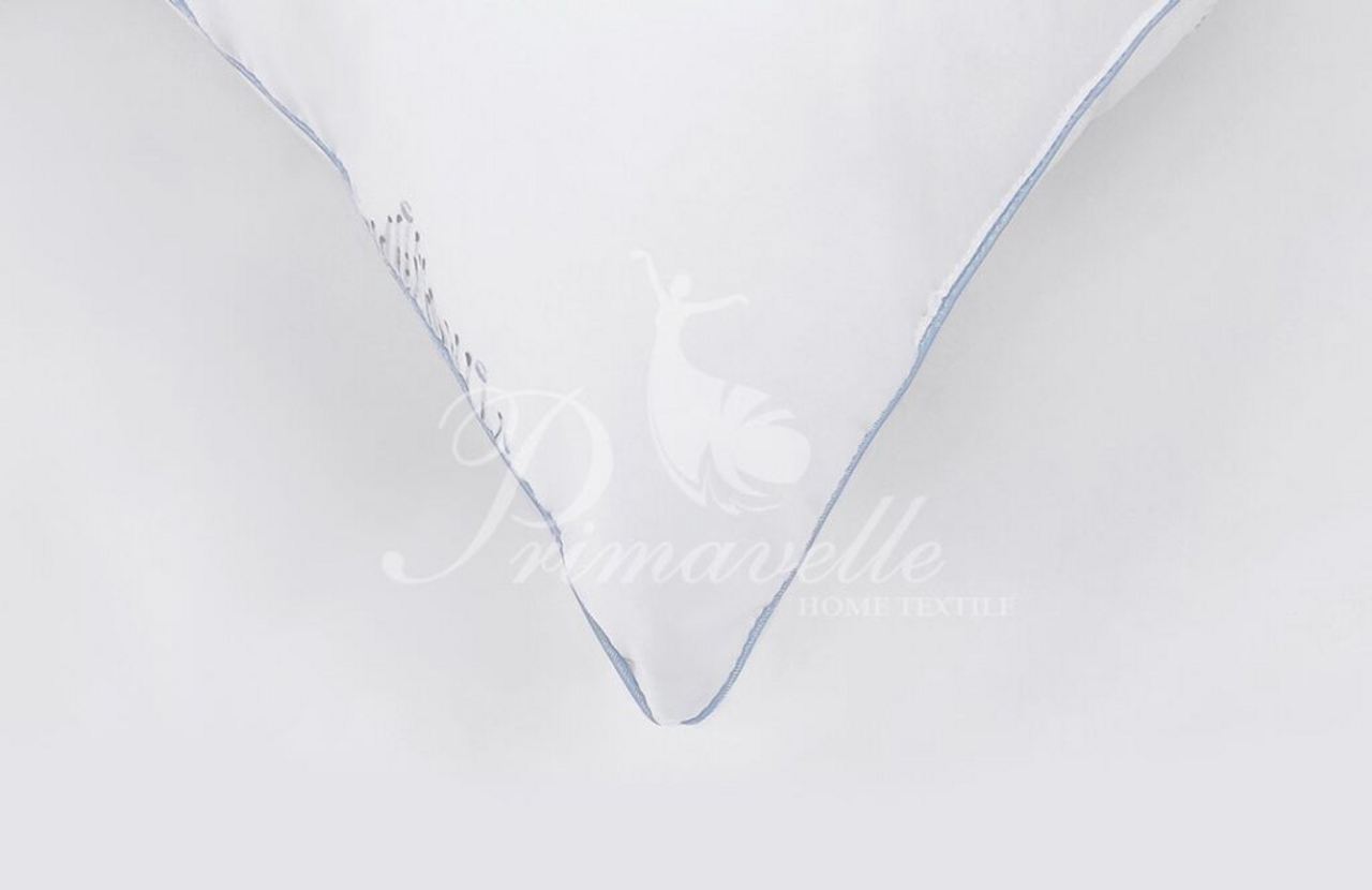 Чехол подушки выполнен из ткани Brushed-твилл. Ткань разработана специально для стран северной Европы и Канады. Она мягкая и бархатистая, обладает повышенной плотностью, хорошо пропускает воздух, не деформируется и быстро сохнет. Благодаря биоцидной обработке против грибков и клещей изделие является безопасным и подарит Вам незабываемый комфорт во время сна. Украшает подушку эксклюзивный принт "перышко" и отделка голубым кантом по периметру. Рисунок имеет отделку мерцающим пигментом, за счет чего изделие выглядит оригинально и красиво и может послужить прекрасным подарком.