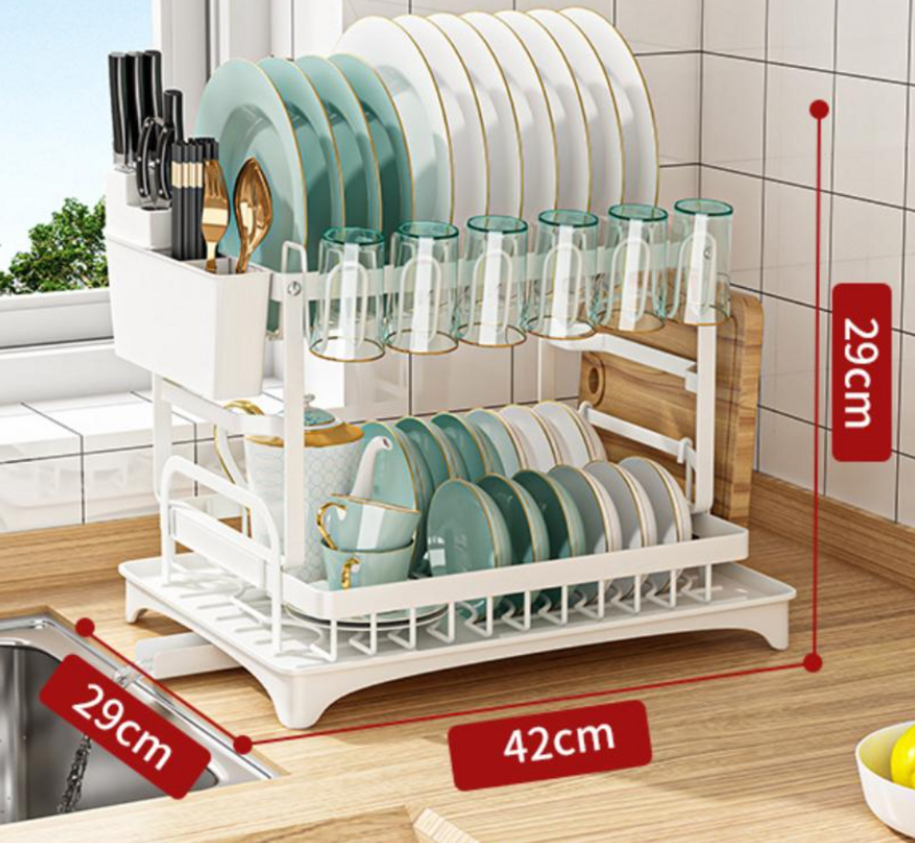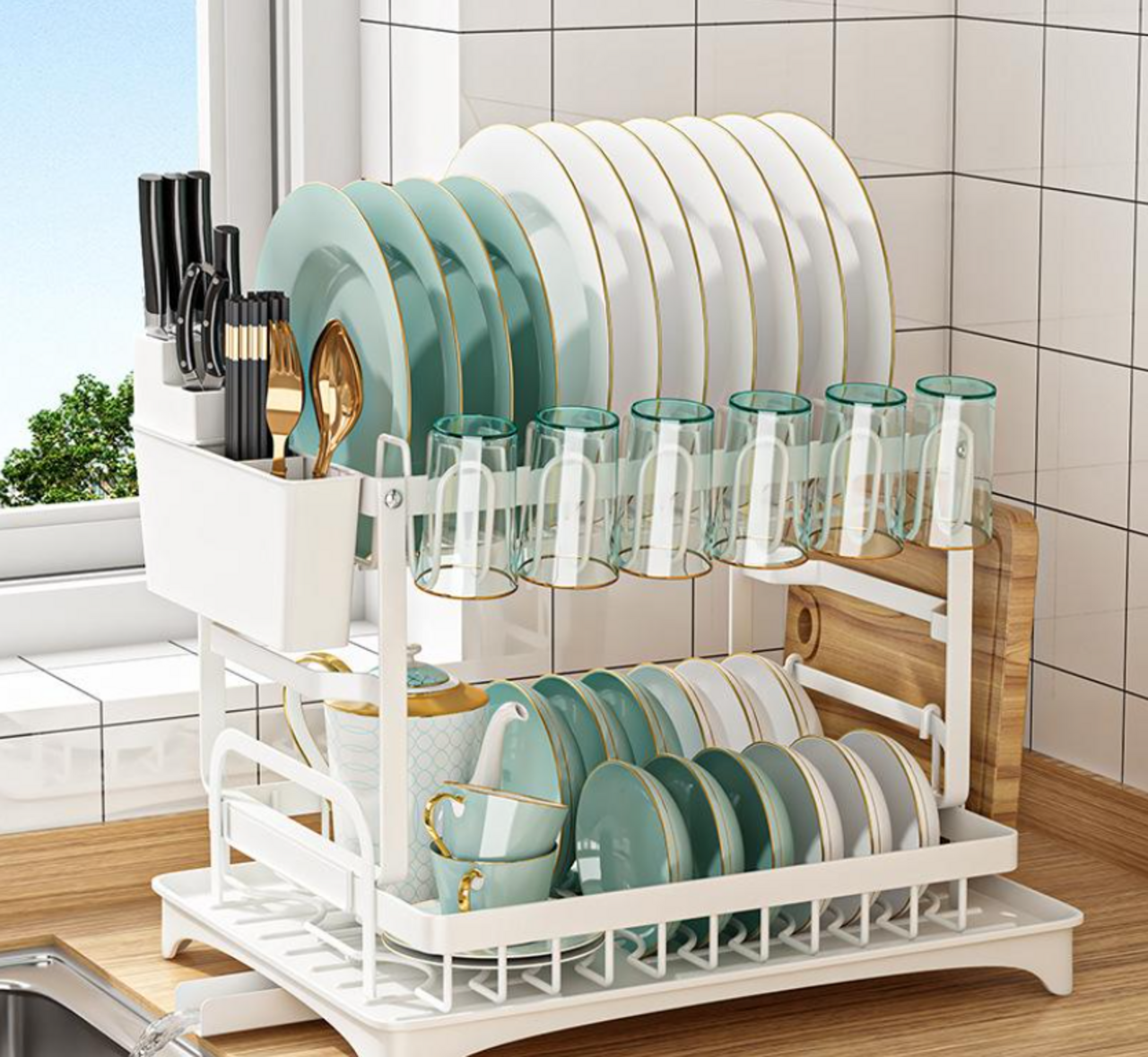 Двухъярусная система позволяет разместить до шести наборов посуды. Большие полки или вместительные поверхности помогают организовать пространство рационально, а компактные размеры позволяют разместить сушилку прямо над раковиной, не загромождая рабочую зону.