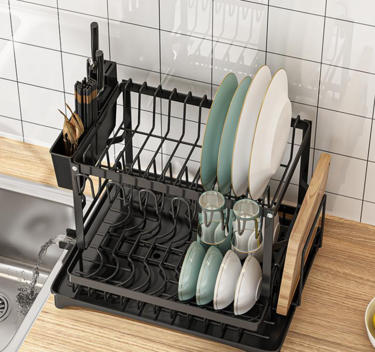 Двухъярусная система позволяет разместить до шести наборов посуды. Большие полки или вместительные поверхности помогают организовать пространство рационально, а компактные размеры позволяют разместить сушилку прямо над раковиной, не загромождая рабочую зону.